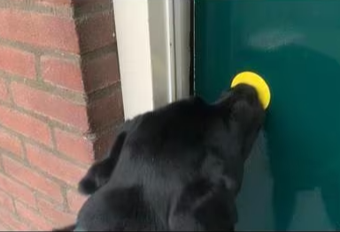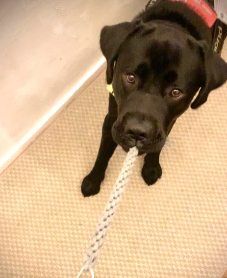 This somewhat stretching cord is made at any requested length and color. It helps a service dog to signal its handler in an easy accessible way.