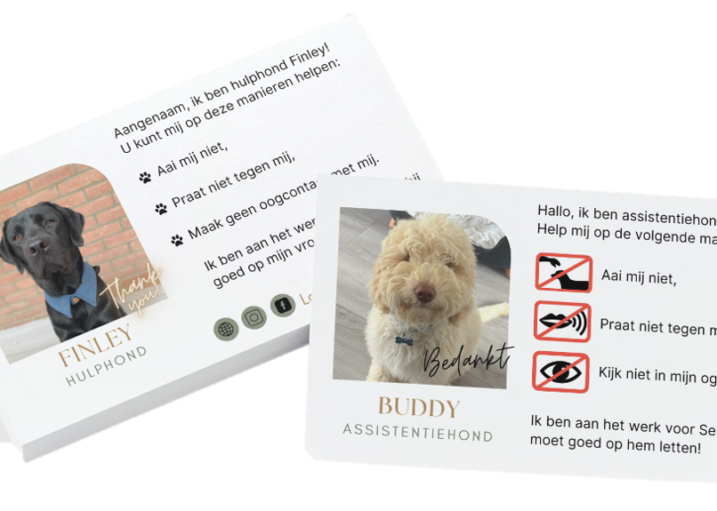 We help design and print small amounts of communication (business like) cards for you and your service dog.